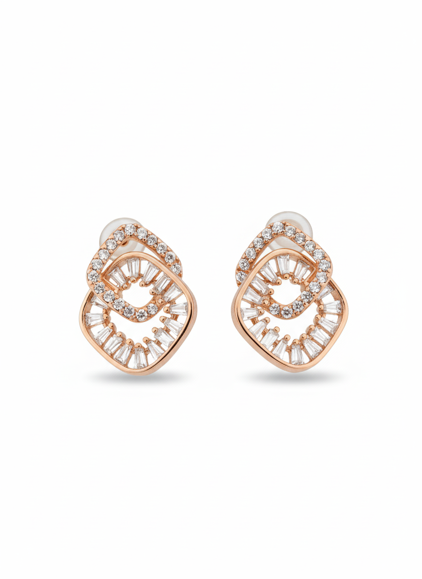 Each stud is crafted from two intertwined geometric shapes in a warm rose gold tone. The outer shape is lined with brilliant round American diamonds (Cubic Zirconia), while the inner shape is filled with striking baguette-cut stones, creating a phenomenal radiating pattern. The unique combination of cuts ensures maximum light reflection and irresistible glamour.