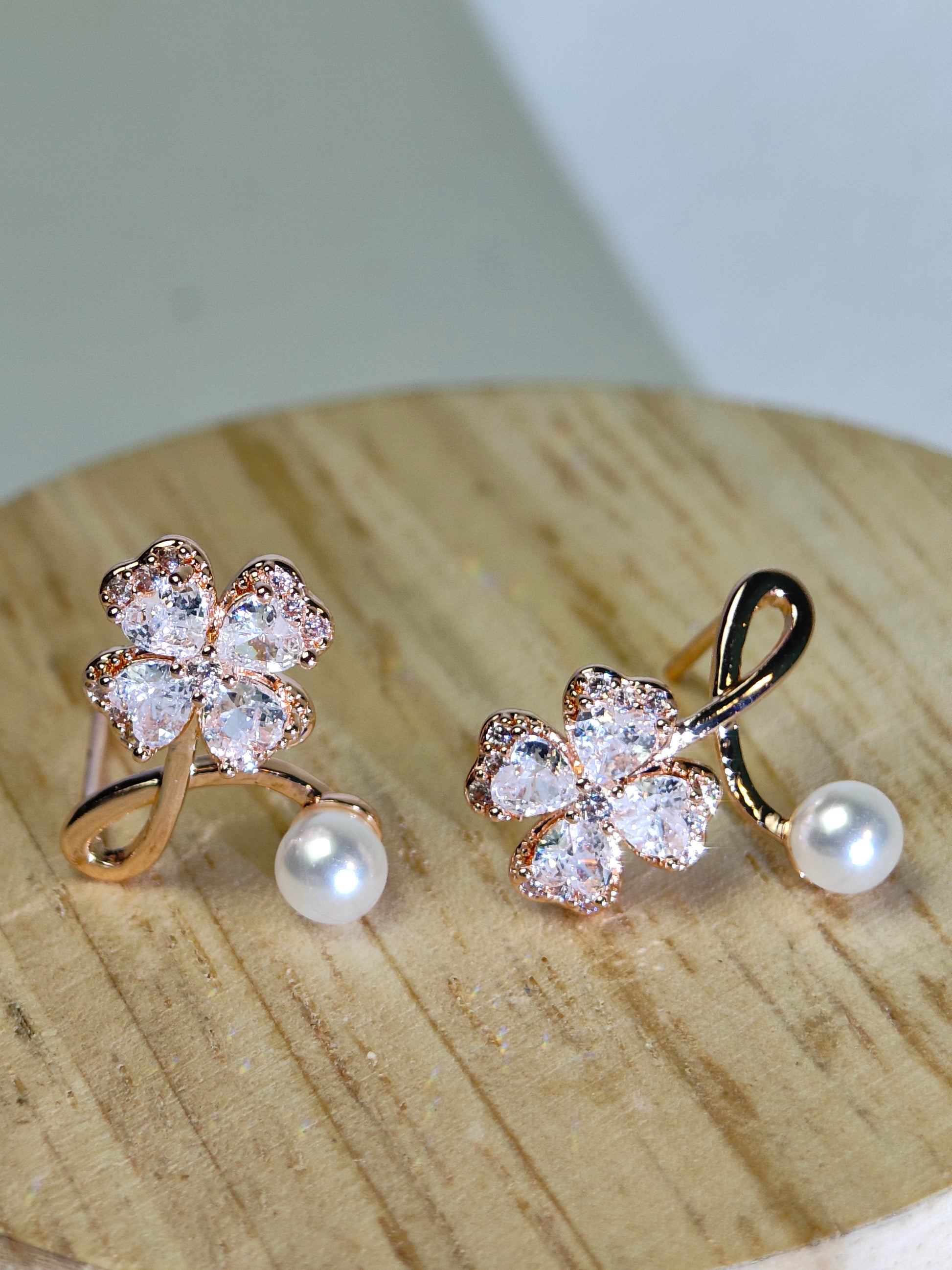 The main piece is a beautiful four-leaf clover, crafted from brilliant American diamonds (Cubic Zirconia) in a warm rose gold-tone. A graceful, looping curve extends up and around the lobe, culminating in a lustrous faux pearl accent. This innovative design makes the earring feel like a statement piece without being too heavy.